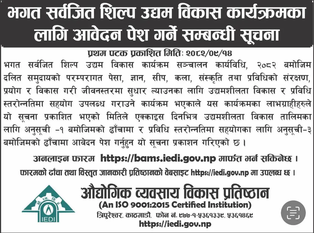 औद्योगिक व्यवसाय विकास प्रतिष्ठान काठमाडौंको भगत सर्वजित उद्यम विकास कार्यक्रमका लागि फारम पेश गर्नेसम्बन्धी सूचना ।